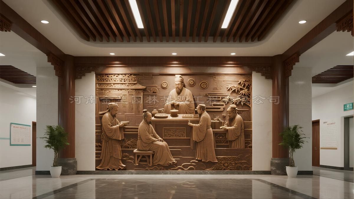 在一幅以“医道溯源”为主题的设计中,浮雕以时间为轴,从神农尝百草的传说开篇,串联起扁鹊“望闻问切”、华佗“麻沸散”创制、孙思邈“大医精诚”等里程碑事件,生动再现了中医数千年来的传承脉络。另一幅“本草春秋”作品,则以工笔般的细腻笔触,刻画了36种常用药材的生长形态,既展现药物特性,又暗合“药食同源”的养生理念。这些设计让墙面成为“可触摸的中医史”,使患者在候诊间隙便能感受传统医学的厚重底蕴。