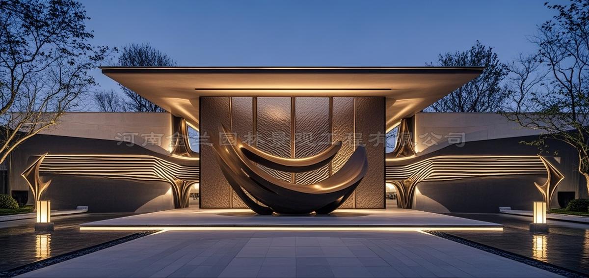 水景与入口是售楼处铜雕的黄金落点。镜面水景与铜雕的组合已成高端楼盘设计标配,水流与铜的质感碰撞能营造宁静雅致的氛围,同时通过光影反射放大空间层次。周口佳利名门项目则在入口设置2.2米高铸铜武士雕塑,黄铜材质经精铸打磨呈现的古典铠甲纹饰,精准传递出楼盘的尊贵定位,其安装过程中,金兰团队巧用塔吊解决狭小空间吊装难题,彰显专业实力。