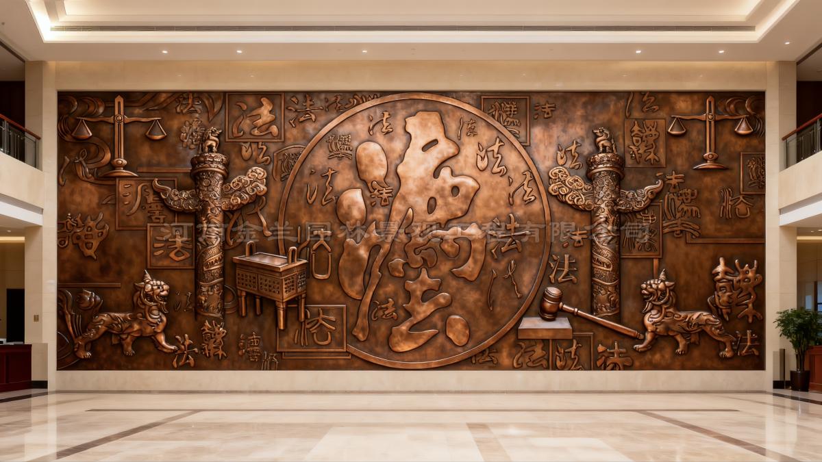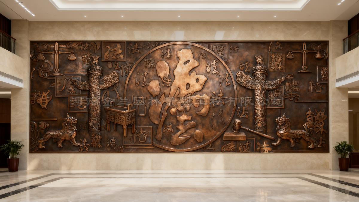 在全面推进依法治国的时代背景下,法治文化建设成为彰显司法精神、传递价值理念的重要载体。金兰园林景观有限公司以精湛工艺为天水市秦安县人民法院新办公楼大厅量身定制的紫铜浮雕壁画正式落成。这幅长7.5米、高4.5米的巨型浮雕,以“法”文化为核心,将传统文化符号与现代司法精神深度融合,成为法院空间中兼具艺术价值与法治内涵的标志性作品。