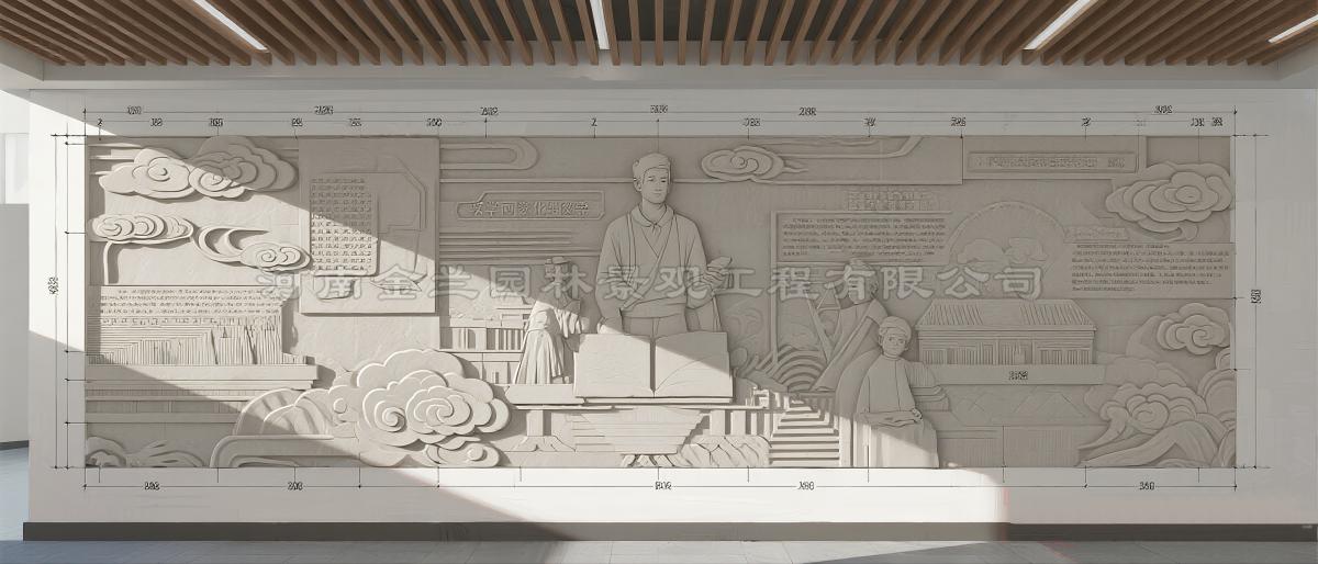 不同学段的教育目标,赋予了浮雕主题鲜明的差异化特征。小学阶段的回廊浮雕,往往以阳光活泼的视觉语言为主,通过明快的色彩与生动的童趣场景,传递成长力量与探索精神,契合儿童认知特点;中学阶段则更侧重传统文化的现代表达,将经典文化符号转化为具象艺术形态,在潜移默化中培育学生的文化认同。金兰园林景观基于对教育规律的深刻理解,能够精准把握不同学段的文化需求,实现艺术表达与教育目标的有机统一。