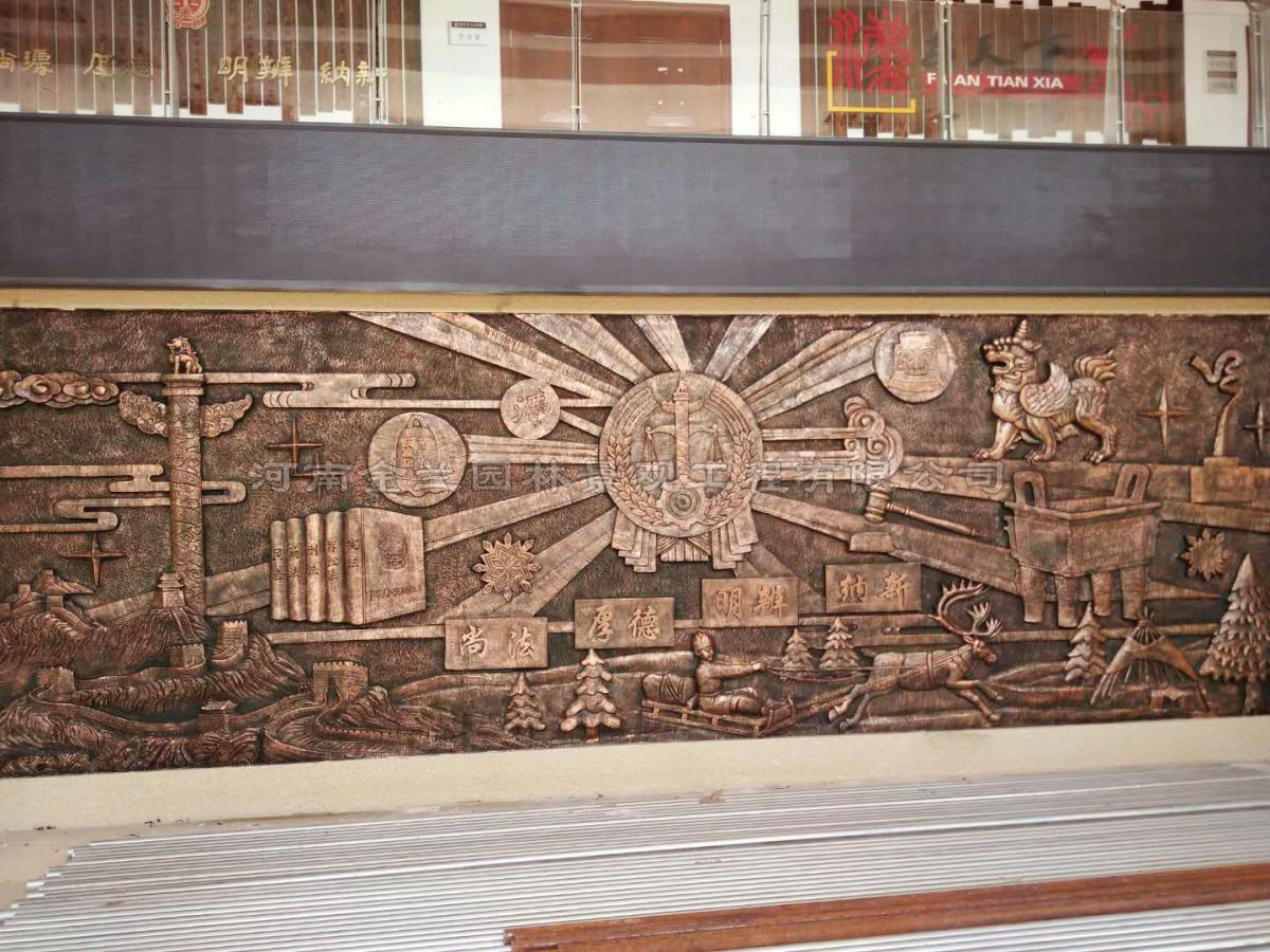 在祖国北疆的呼伦贝尔,一座承载法治精神与地域文化的艺术丰碑近日落成。金兰园林景观有限公司受委托,为其大厅照壁精心设计制作了正反两面浮雕文化墙。单幅长 7.5 米、高 2.5 米的宏大气势,结合手工泥塑、玻璃钢翻制及仿铜效果处理工艺,使浮雕既具历史厚重感,又彰显现代司法的人文温度,成为法院文化建设的标志性作品。
