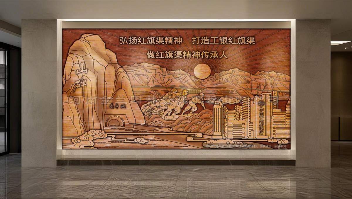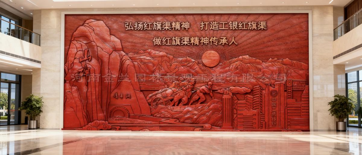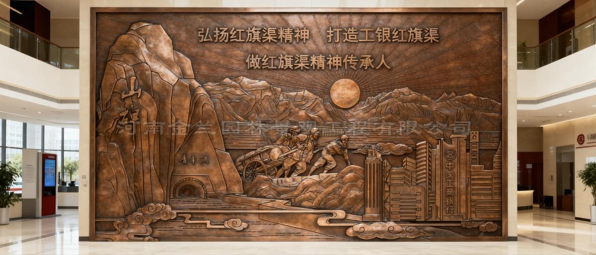 在红旗渠精神的发源地林州,金兰园林景观设计工程有限公司以艺术匠心完成了一次跨越时空的精神对话。尽管因建筑空间规划调整,这幅承载着红旗渠文化与工商银行品牌融合愿景的大型浮雕未能最终落地,但其设计方案展现出的艺术高度与专业价值,仍为金融空间文化建设提供了极具启发性的创新样本。